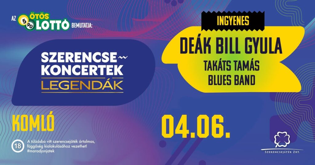 Mi, komlóiak megint nem panaszkodhatunk. A szerencse április 6-án (hétfőn) Deák Bill Gyulát és a Takács Tamás Blues Band-et sodorta városunkba. Várhatóan ismét nagyszínpad épül, és a Szerencsejáték támogatásának jóvoltából – a szeptemberihez hasonlóan magas színvonalú hangzásvilág fogadja a rock szerelmeseit. A koncert ingyenes és nincs szükség regisztrációra. A program: 16 óra kapunyitás – 18 óra Takáts Tamás Blues Band 19:15 Deák Bill Gyula